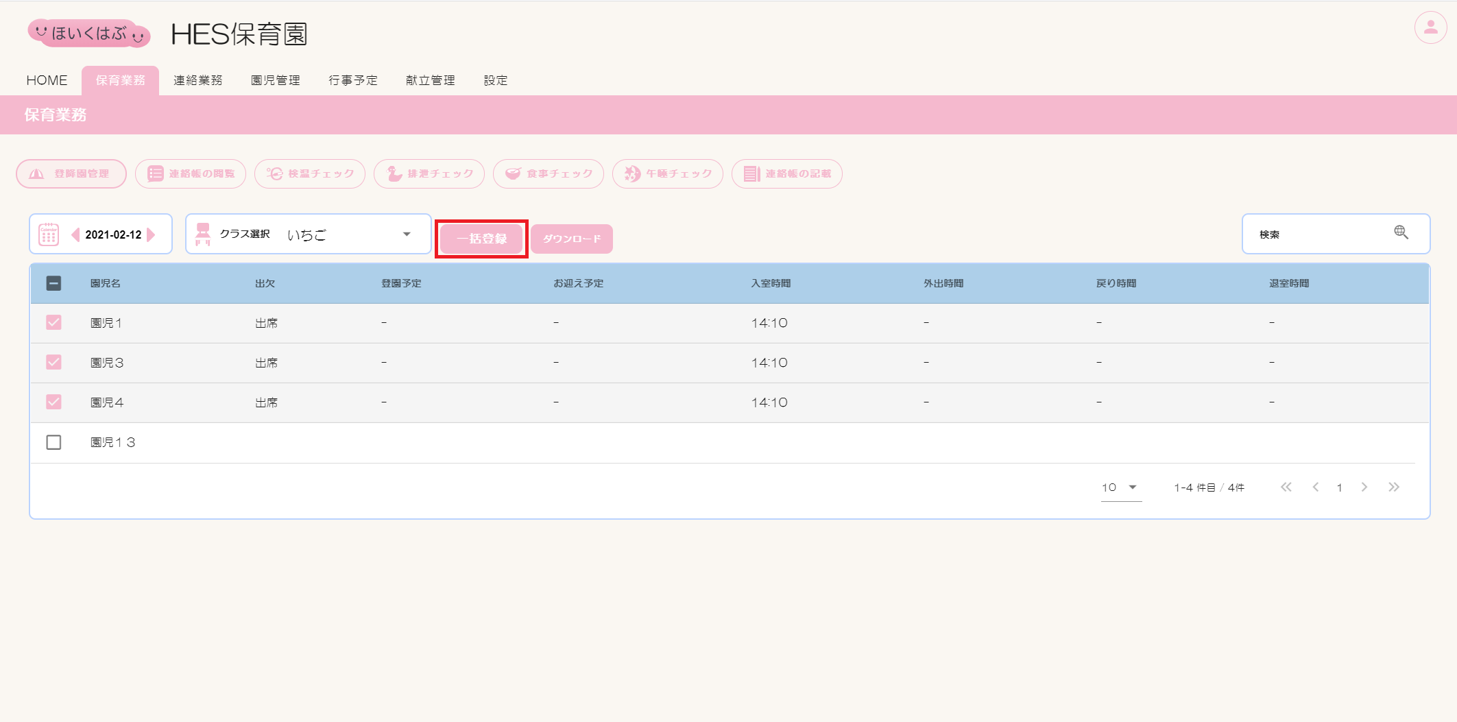 複数チェックする場合は、人数分のチェックボックスにチェックを入れるか、【園児名】の左横にあるチェックボックスにチェックを入れます。