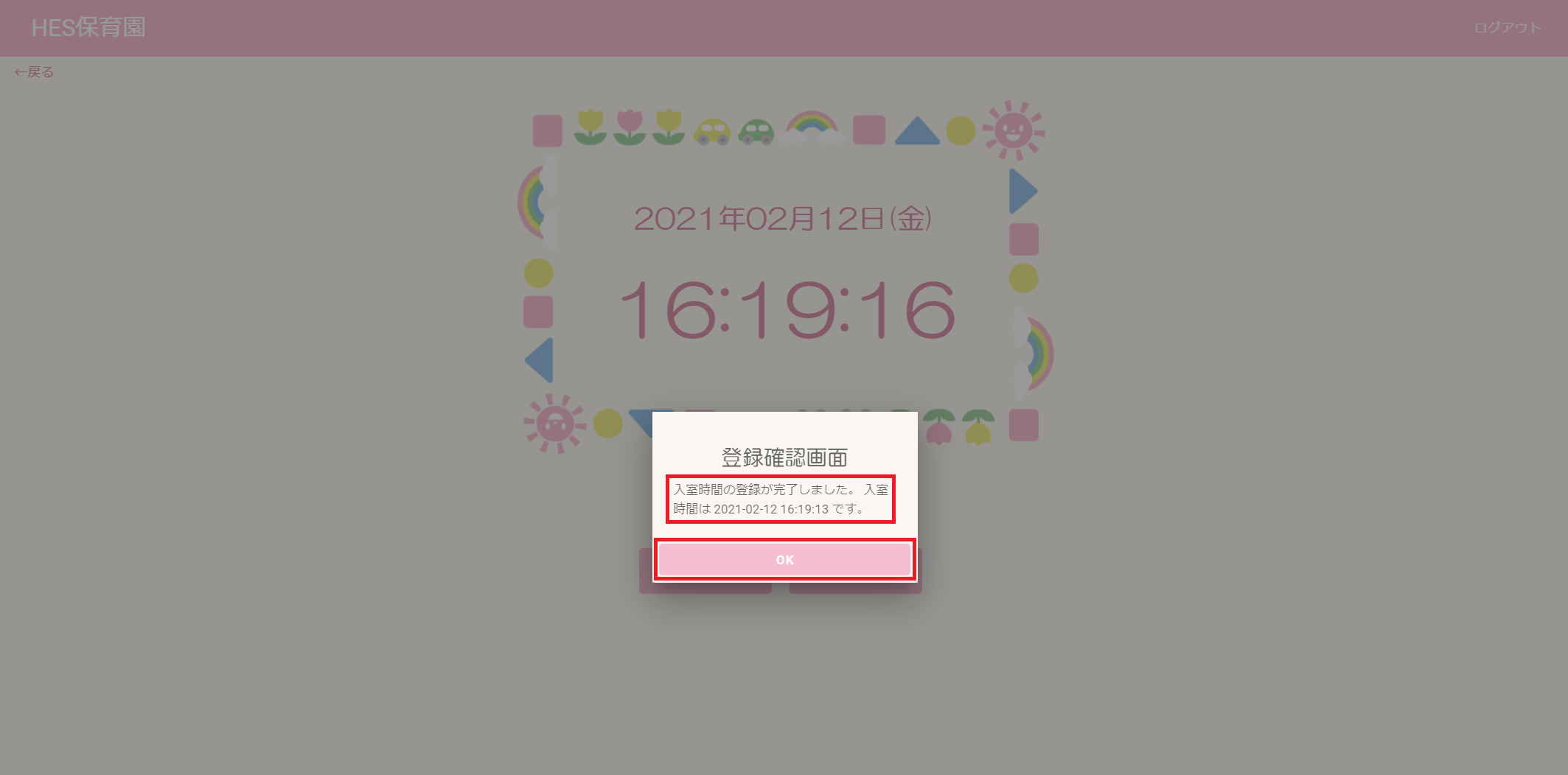 ③表示された園児名が正しいことを確認し、[入室]ボタン または [退室]ボタンをクリックします。