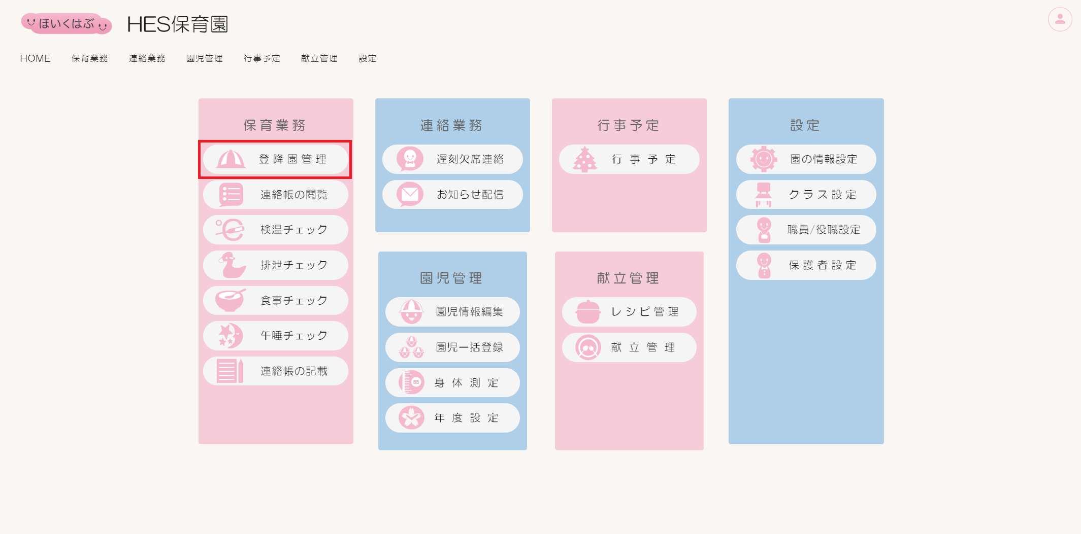 ほいくはぶトップページの[登降園管理]ボタンをクリックします。