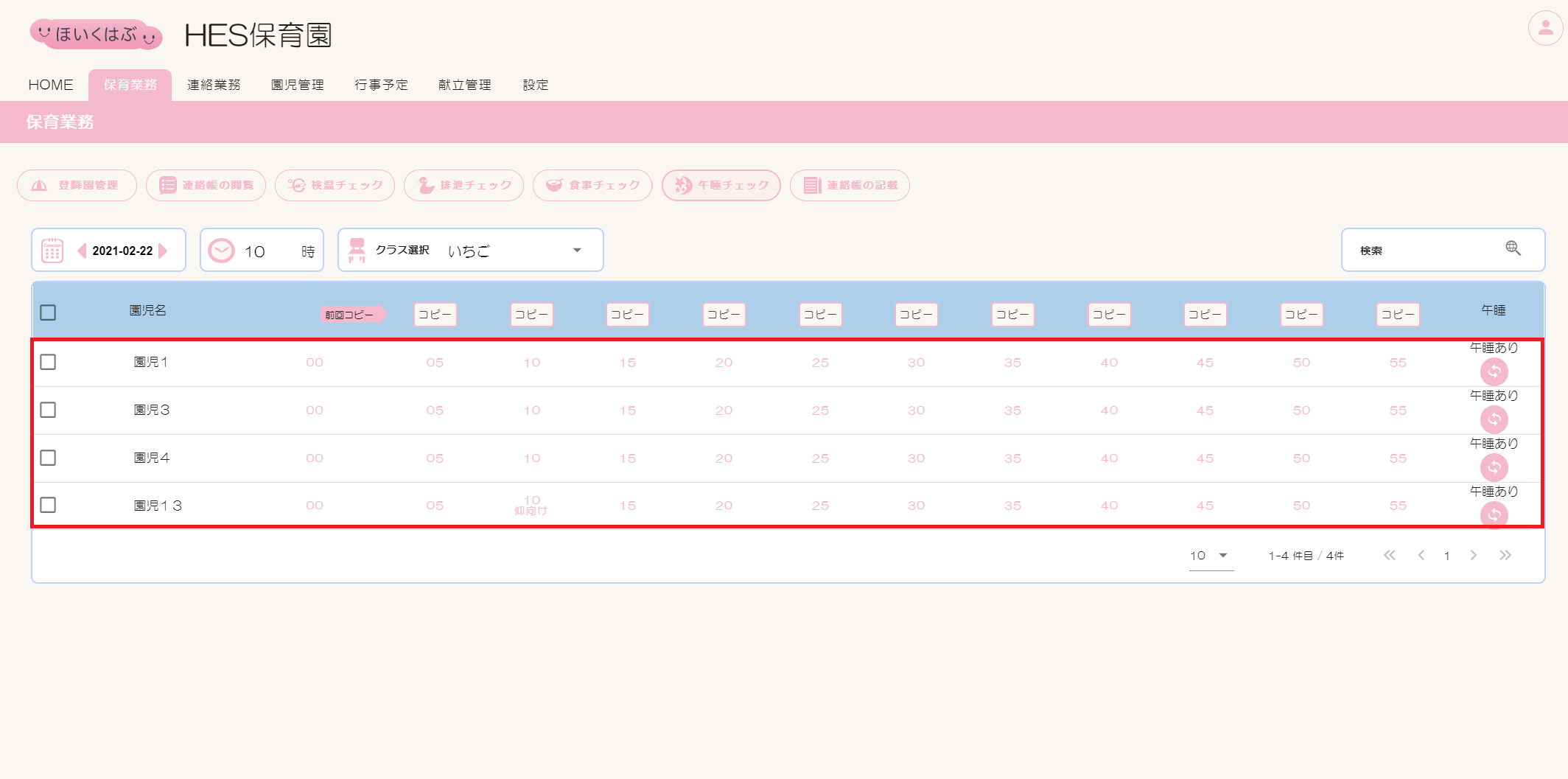 複数チェックする場合は、人数分のチェックボックスにチェックを入れるか、【園児名】の左横にあるチェックボックスにチェックを入れます。
