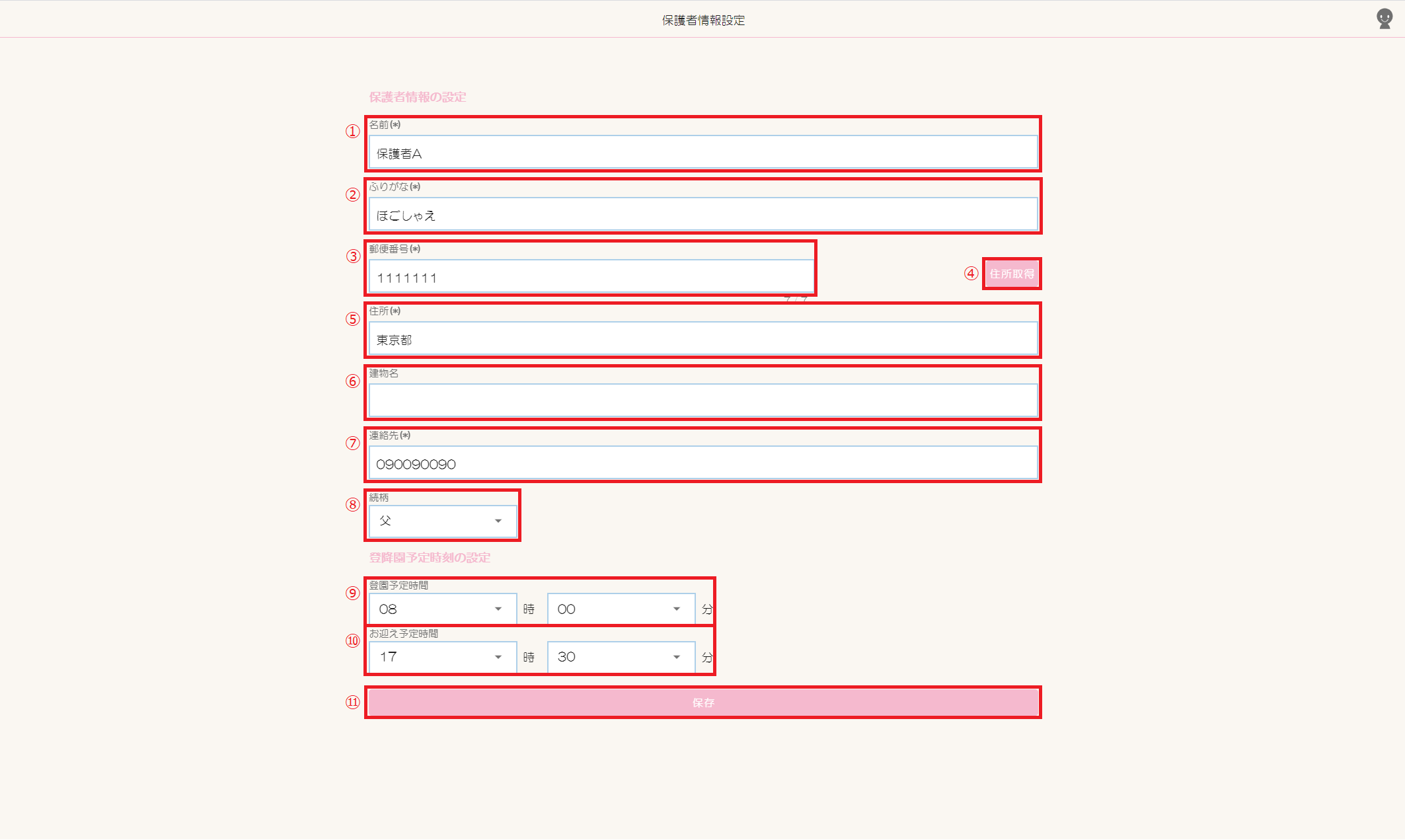 「保護者情報編集」は保護者情報の編集と登降園予定時間の設定を行います。