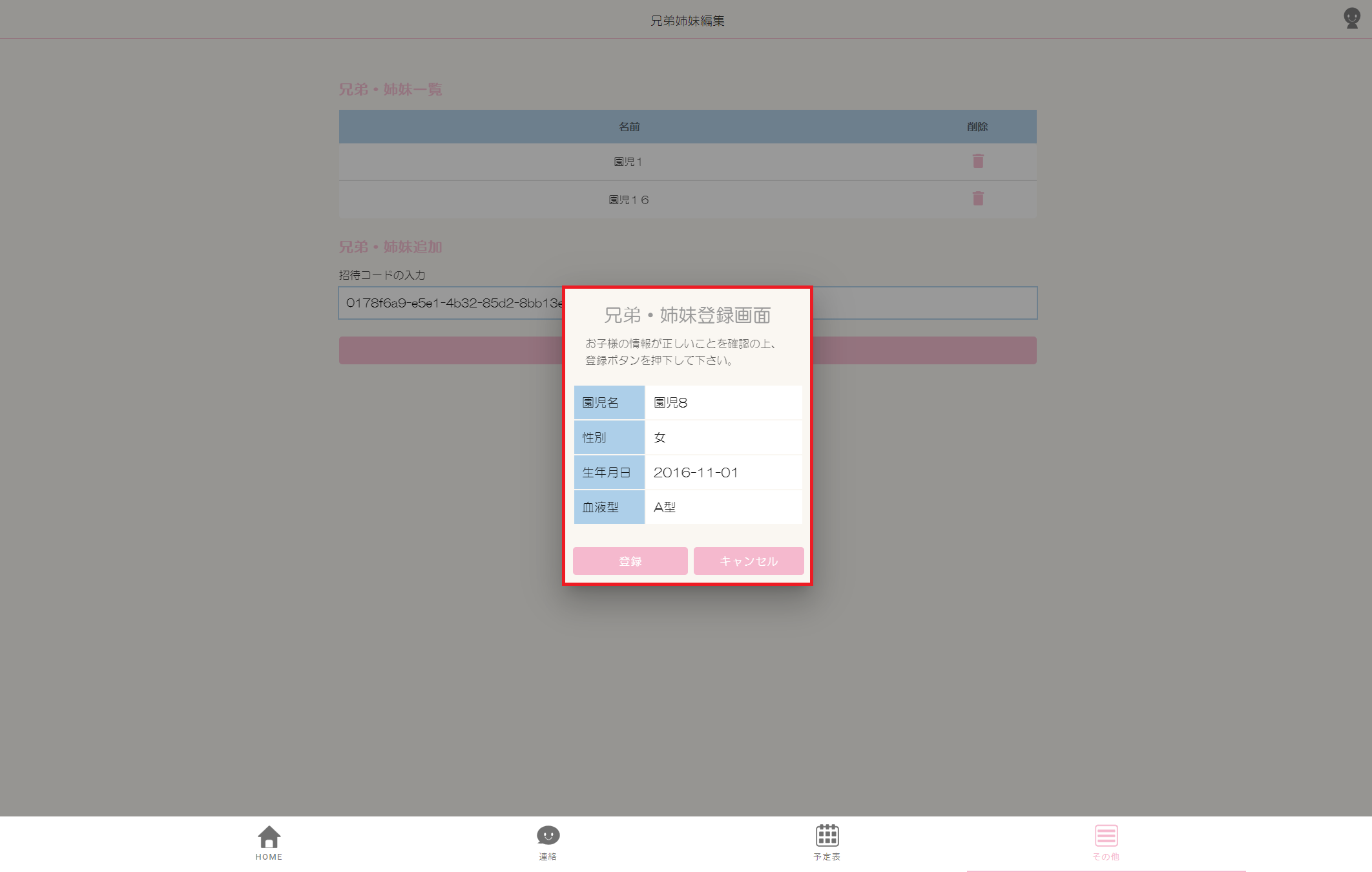 ①兄弟姉妹を追加する場合は【招待コードの入力】欄に園から発行された招待コードを入力します。