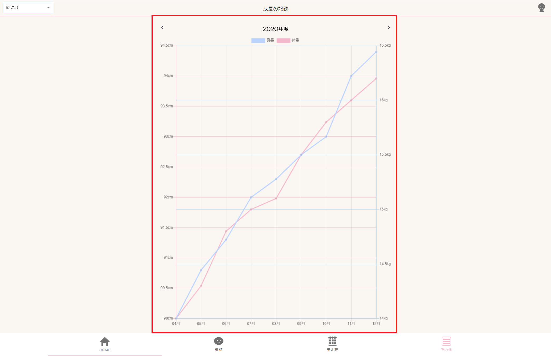 フッダーメニュー【その他】を選択し、その他画面の[成長の記録]ボタンからも移動可能です。