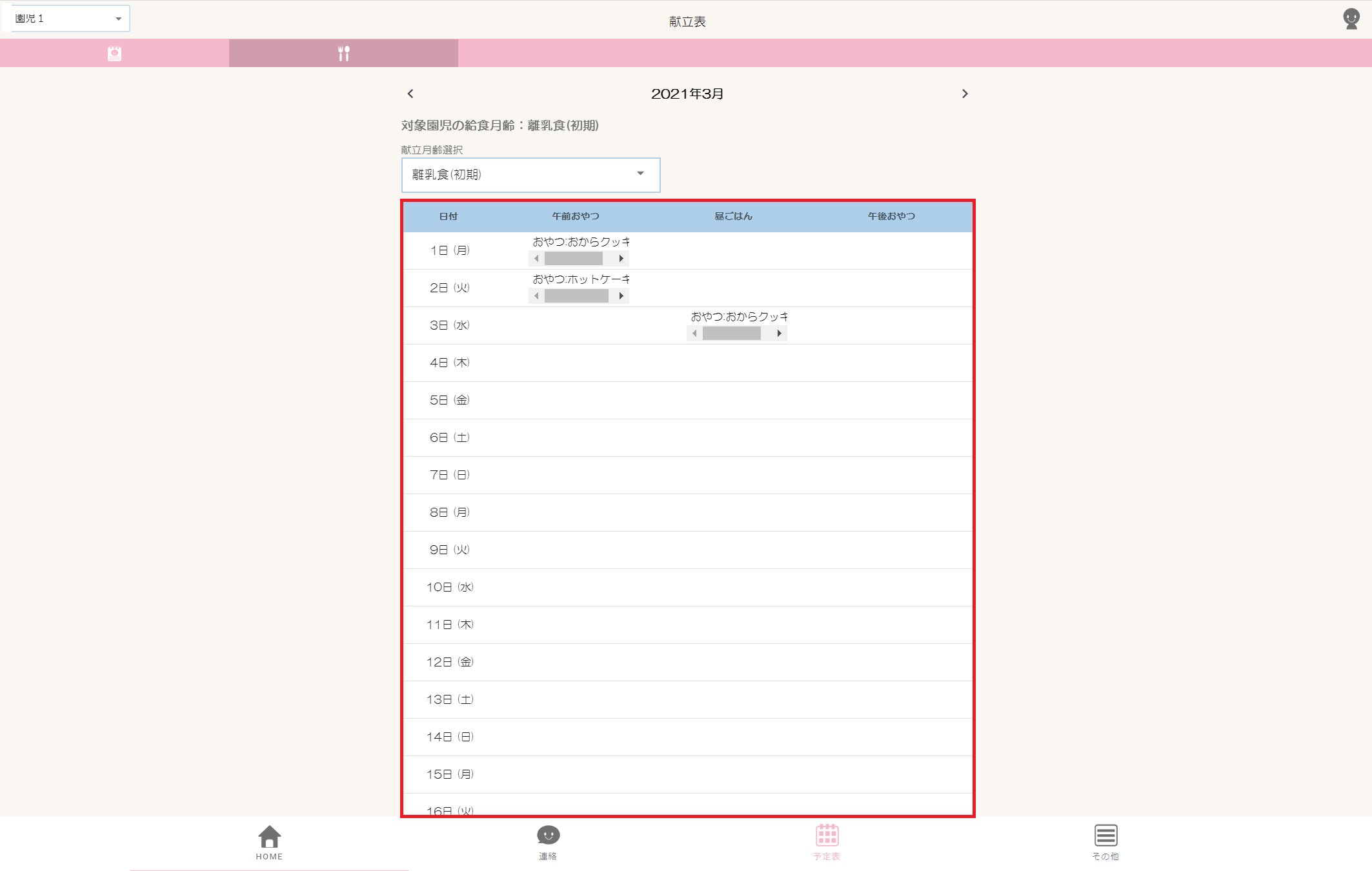 | 2 | 献立月齢選択 | 月齢を選択できます。初期値は園児の月齢です。 |