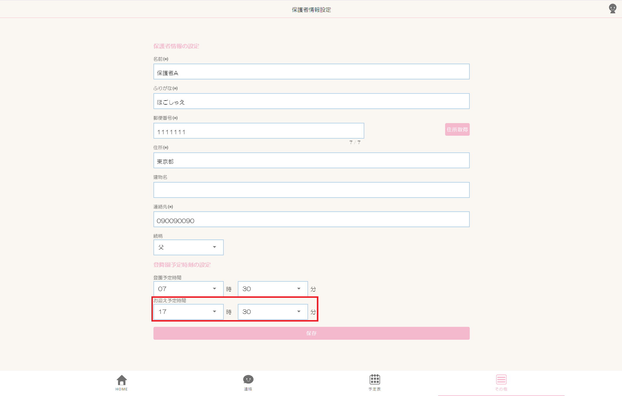 | お迎え予定時間 | お迎え予定時間を設定できます。 |