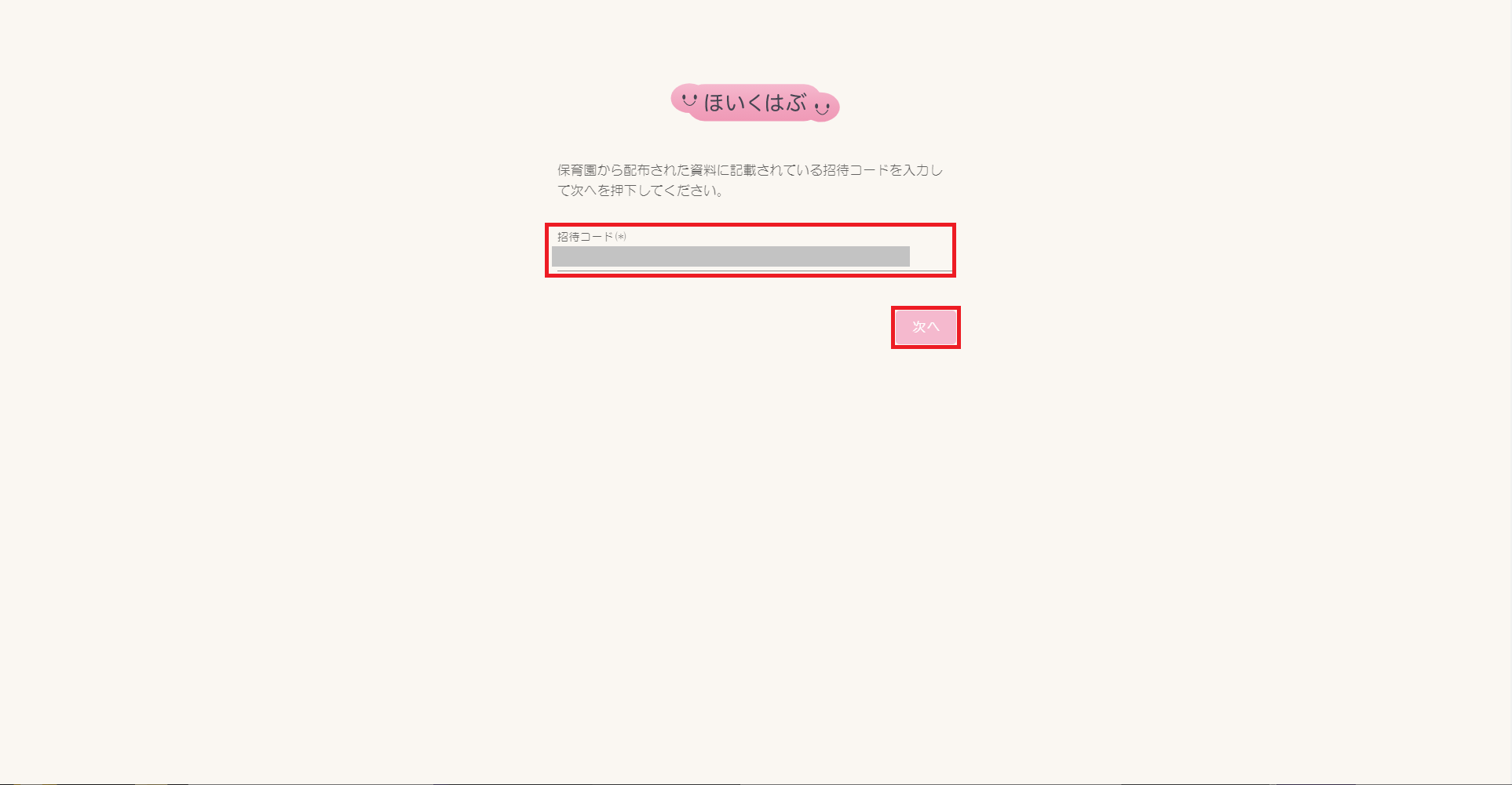 ③ほいくはぶ初回ログイン画面が表示されますので【招待コード】欄に招待コードを入力し、[次へ]をクリックします。