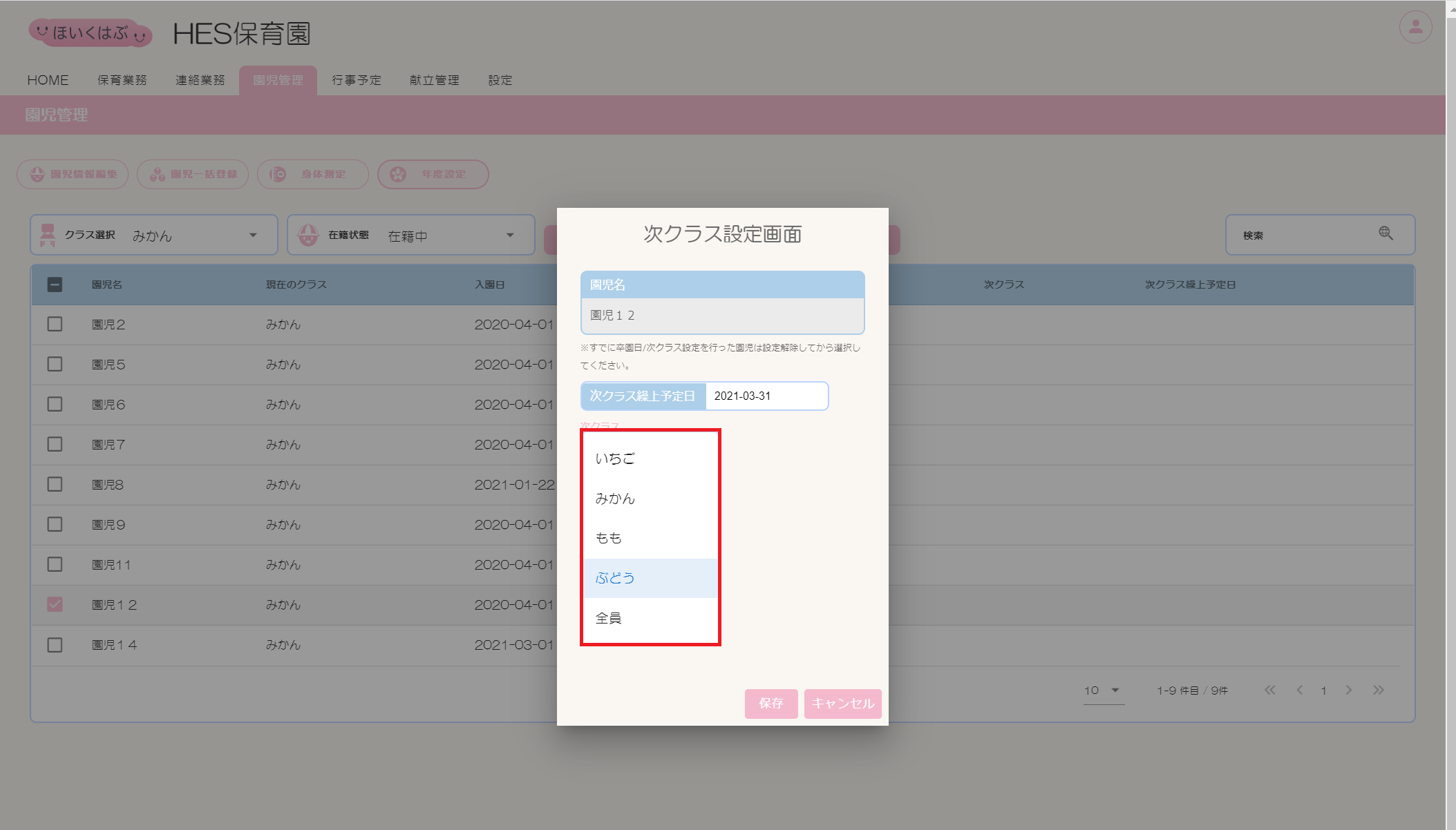 設定日付以降は「次クラスに進級」となり、対象園児の情報は新クラス(次クラスで設定したクラス)に表示されます