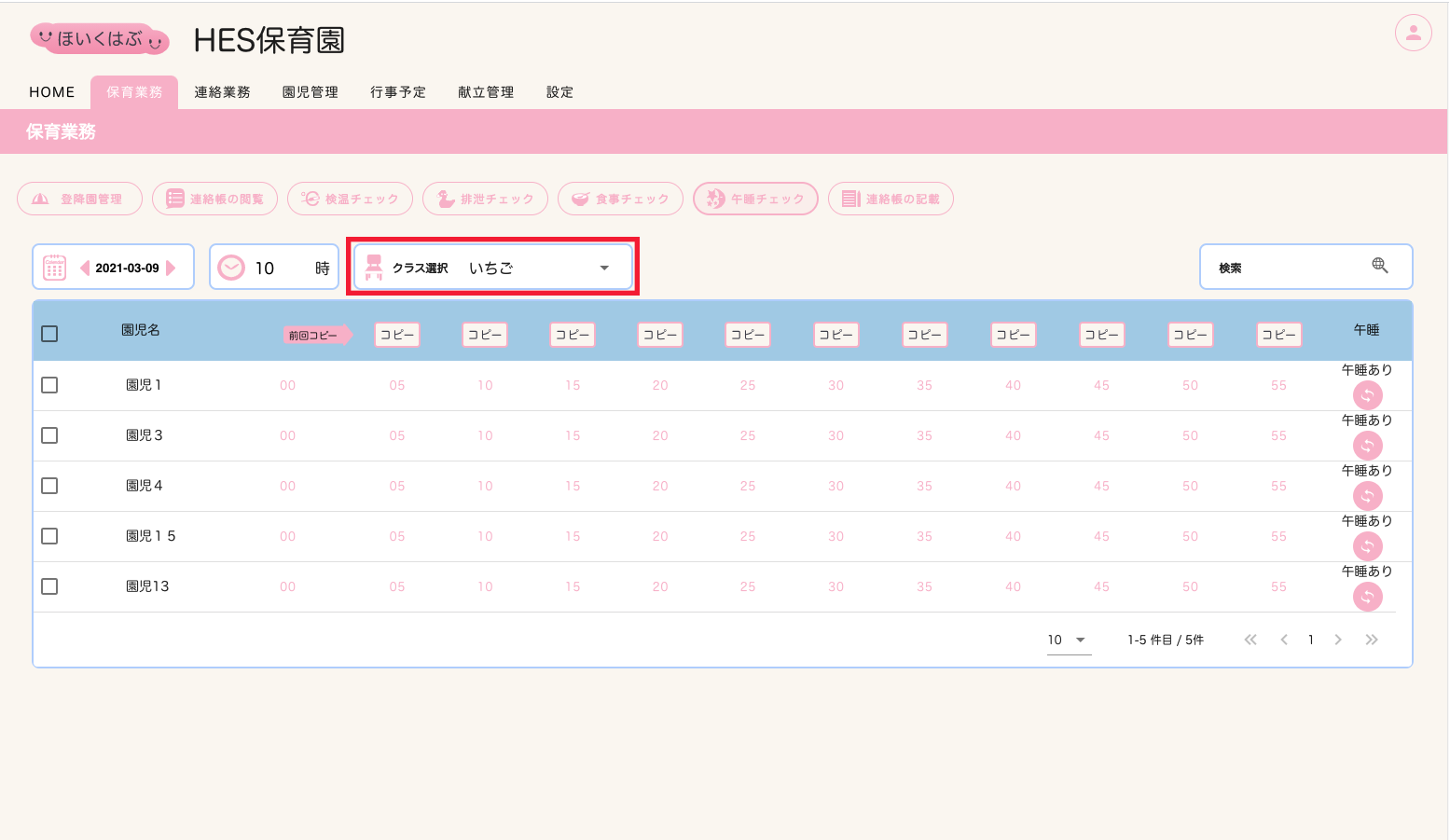①クラス選択セレクタの初期値はログインアカウント(保育士または管理者)に紐づいているクラスです。